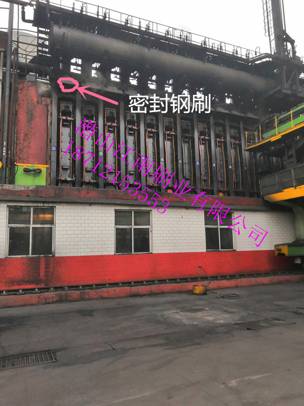 焦化厂焦炉在装煤过程中采用炉顶加地面除尘站抽吸的无烟装煤工艺,由于炉面导烟管与炉口密封配置简单。(及导烟口与炉孔为干式密封)密封效果不好,大大降低了吸管对烟尘的抽吸能力,导致装煤时炭化室有较多的烟尘溢出,同时在启闭炉盖时,会导致进入集气管的气体量急剧变化,引起集气管的压力大幅波动,加剧焦炉的冒烟状况,环保压力较大,我公司设计的焦炉炉口密封可调性钢刷装置,采用弹簧调节,炉口在运行当中,弹簧可任意调节,随着运动改变密封状态。刷毛随着炉口运动,钢丝能耐900度左右,采用四层钢刷密封,刷头可更换,