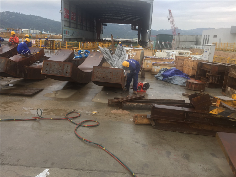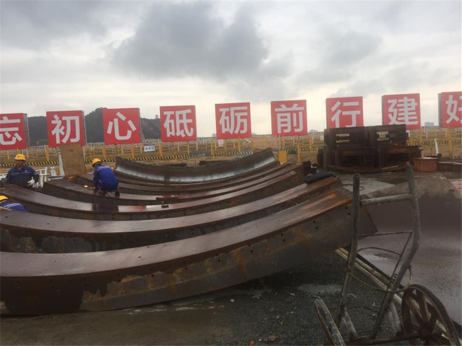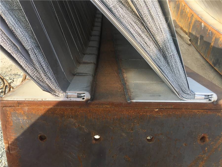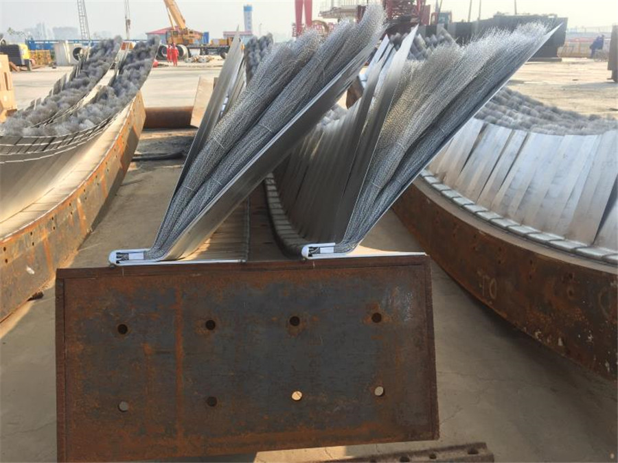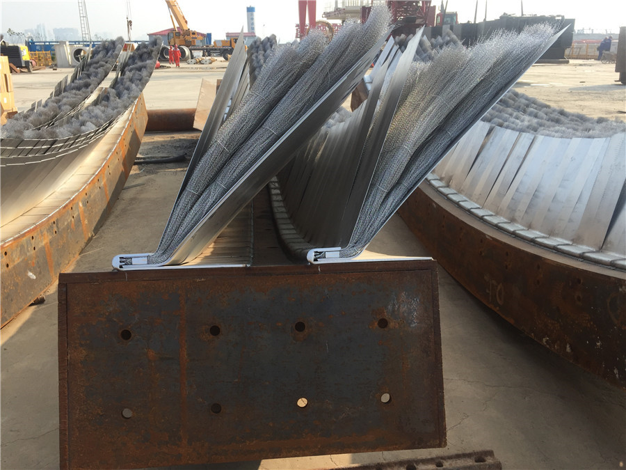 利用管片安装机将事先准备好的长度800mm的16个撑垫安放于管片与推进油缸之间,手动将每个油缸都抵紧撑垫,利用推进油缸向前顶推盾构掘进700mm,此时露出两道盾尾刷; 露出两道盾尾刷示意图 16个撑垫布置示意图 (4)移动并伸出管片安装机抓举头,将点位①处的撑垫固定在安装机上,缩回点位①处的推进油缸,拆除点位①的撑垫,同理拆除点位②的撑垫; (5)将密封刷及沟槽上的油脂、砂浆等干净,再开始割除尾刷。然后将尾刷割除的***打磨平整,再开始焊接新的密封刷。焊完后,在新密封刷上涂抹盾尾密封油脂; (6)利用管片安装机安装点位处的撑垫,将点位①和②处的推进油缸将点位①和②处的撑垫顶紧,然后拆除点位③和④处的撑垫; (7)重复步骤(5),更换新的密封刷,然后按照上述步骤顺次更换其余密封刷(每次只拆除相邻两个点位的撑垫) 盾尾密封刷技术标准 1、保护板采用SAE1566弹簧钢,前保护板为双层,1.0加0.5,后保护板为2片1.0加强型,采用特殊工艺(专用压模)热处理HRC45-47.确保弹性和耐磨性, 钢丝刷刷丝采用¢0.3直径不锈钢丝,确保弹性,不生锈、不断裂。 2、销钉采用低碳钢(Q345),确保焊接性能和耐磨。 3、尾刷中间丝网采用40目高密度不锈钢材质。 4、上盖板,底座板,采用Q235。 5、总装采用专用工夹具和20T专用液压机叠加挤压工艺进行总装 6、焊接工艺采用专用二氧化碳气体保护焊接. 7、成品保护板热处理后,,抽检不低于10%采用20T液压机连续500次冲压确保产品变形度小于2.5度 8、组装后的盾尾刷其钢丝应有双曲且整齐无乱丝,断丝,钢板光滑无毛边,两侧面平整无细丝外露,产品表面做防锈处理,每个成品净重控制在正负0.1公斤。